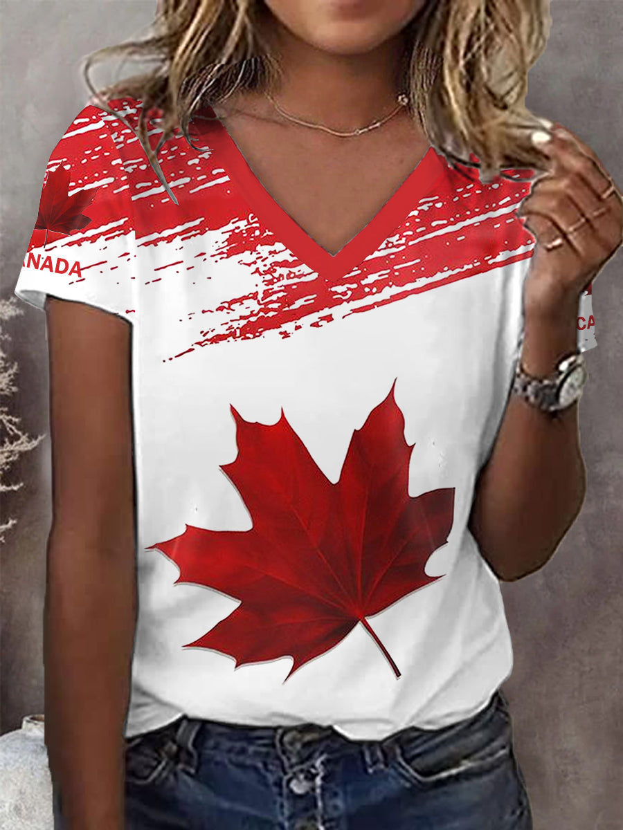 Women's Canadian Maple Leaf Print Casual V-Neck Tee
